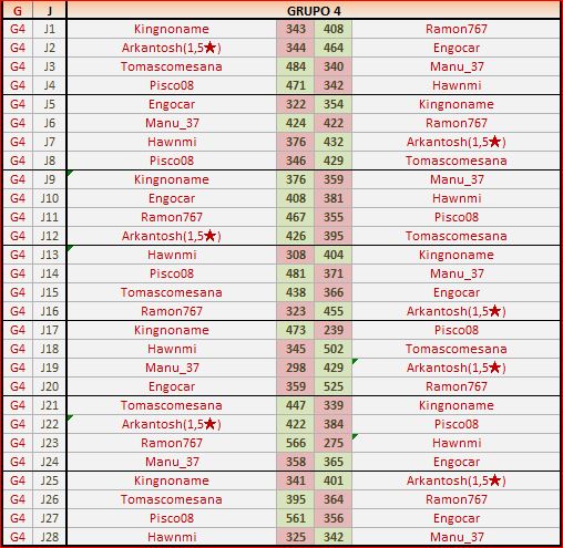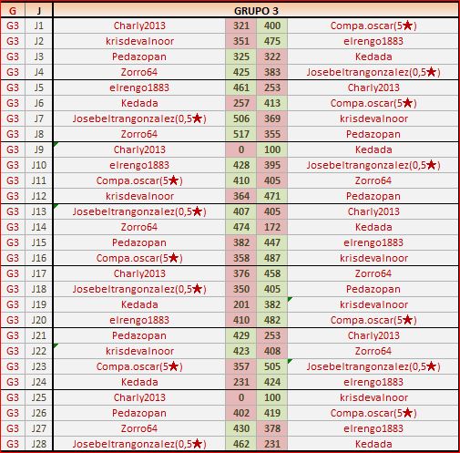 Deja un comentarioEn está página se irán publicando los resultados de las diferentes partidas, siendo ambos jugadores responsables de subirlos o de comprobar que ya hayan sido publicados, insertando un COMENTARIO en la parte inferior de la pantalla (opción “Deja tu comentario”), indicando el nombre de los dos jugadores y los puntos obtenidos en la partida.