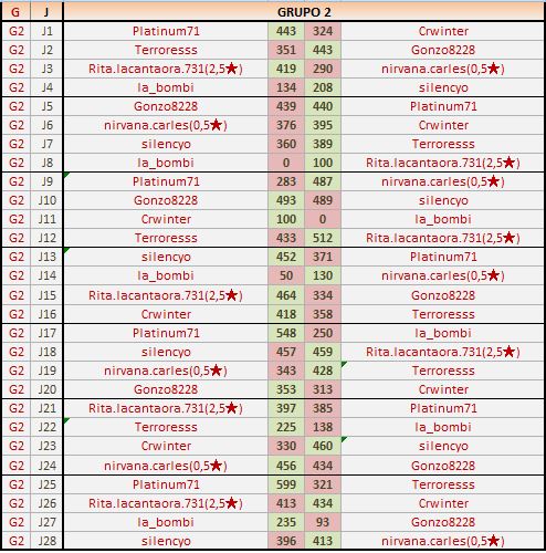 Deja un comentarioEn está página se irán publicando los resultados de las diferentes partidas, siendo ambos jugadores responsables de subirlos o de comprobar que ya hayan sido publicados, insertando un COMENTARIO en la parte inferior de la pantalla (opción “Deja tu comentario”), indicando el nombre de los dos jugadores y los puntos obtenidos en la partida.