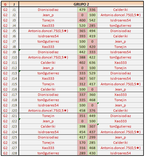 Deja un comentarioEn está página se irán publicando los resultados de las diferentes partidas, siendo ambos jugadores responsables de subirlos o de comprobar que ya hayan sido publicados, insertando un COMENTARIO en la parte inferior de la pantalla (opción “Deja tu comentario”), indicando el nombre de los dos jugadores y los puntos obtenidos en la partida.