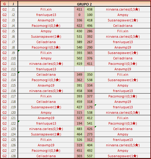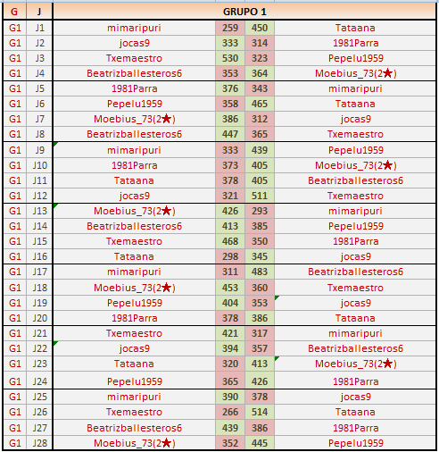 Deja un comentarioEn está página se irán publicando los resultados de las diferentes partidas, siendo ambos jugadores responsables de subirlos o de comprobar que ya hayan sido publicados, insertando un COMENTARIO en la parte inferior de la pantalla (opción “Deja tu comentario”), indicando el nombre de los dos jugadores y los puntos obtenidos en la partida.