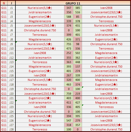 Deja un comentarioEn está página se irán publicando los resultados de las diferentes partidas, siendo ambos jugadores responsables de subirlos o de comprobar que ya hayan sido publicados, insertando un COMENTARIO en la parte inferior de la pantalla (opción “Deja tu comentario”), indicando el nombre de los dos jugadores y los puntos obtenidos en la partida.