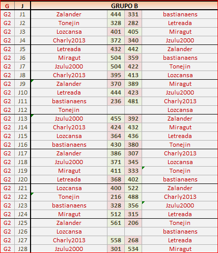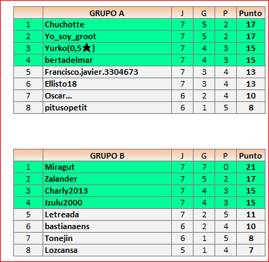 Deja un comentarioEn está página se irán publicando los resultados de las diferentes partidas, siendo ambos jugadores responsables de subirlos o de comprobar que ya hayan sido publicados, insertando un COMENTARIO en la parte inferior de la pantalla (opción “Deja tu comentario”), indicando el nombre de los dos jugadores y los puntos obtenidos en la partida.
