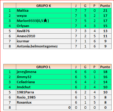 Deja un comentarioEn está página se irán publicando los resultados de las diferentes partidas, siendo ambos jugadores responsables de subirlos o de comprobar que ya hayan sido publicados, insertando un COMENTARIO en la parte inferior de la pantalla (opción “Deja tu comentario”), indicando el nombre de los dos jugadores y los puntos obtenidos en la partida.