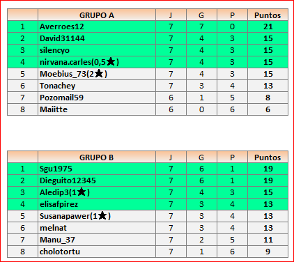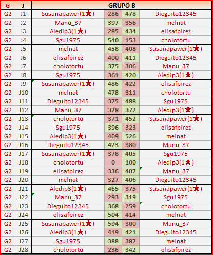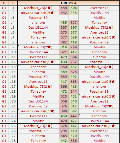 Deja un comentarioEn está página se irán publicando los resultados de las diferentes partidas, siendo ambos jugadores responsables de subirlos o de comprobar que ya hayan sido publicados, insertando un COMENTARIO en la parte inferior de la pantalla (opción “Deja tu comentario”), indicando el nombre de los dos jugadores y los puntos obtenidos en la partida.