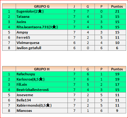 Deja un comentarioEn está página se irán publicando los resultados de las diferentes partidas, siendo ambos jugadores responsables de subirlos o de comprobar que ya hayan sido publicados, insertando un COMENTARIO en la parte inferior de la pantalla (opción “Deja tu comentario”), indicando el nombre de los dos jugadores y los puntos obtenidos en la partida.