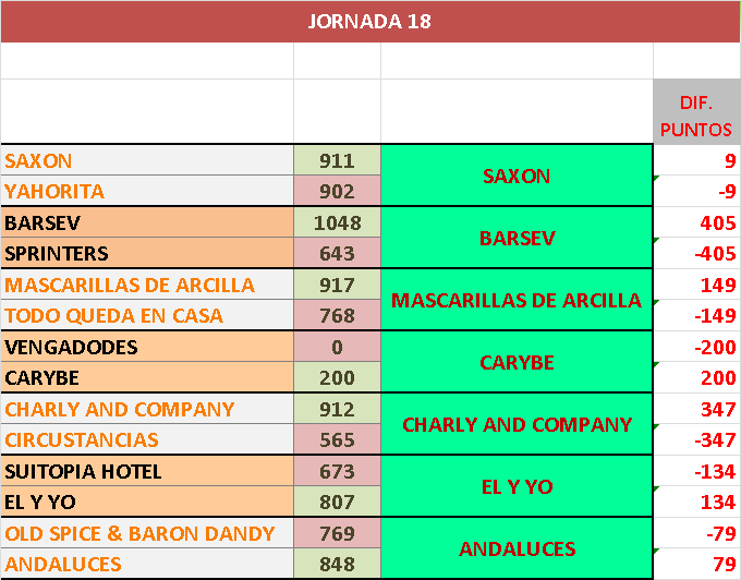 Creo que hay un error en el cómputo de los puntos de desempate de Barsev. En lo publicado aparecen 59, cuando en la jornada 17 llevabamos 879, y en la 18 hemos sumado 405 más. Lo cual hace un total de 1.284.
