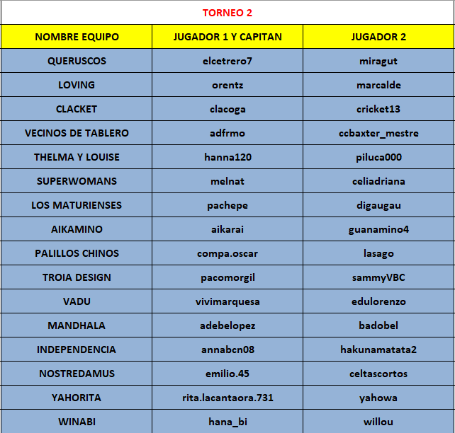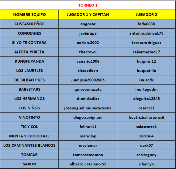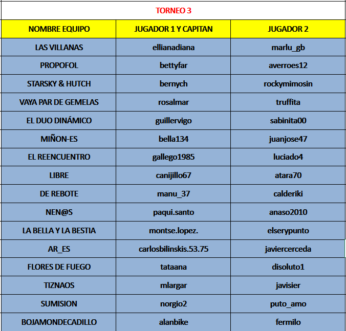 • NO existen empates. Sólo vale ganar o perder. El resultado será la suma de puntos de cada uno de los componentes de cada Equipo.
