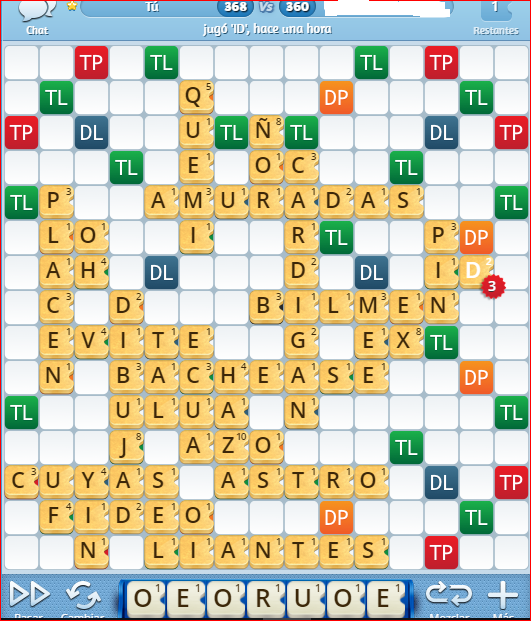 Rectifico , no tiene espacio por encima de astro . Que haya jugado id , es por ser sabedor que solo tenemos una consonante , de lo contrario seria muy arriesgado . Es decir , el tiene las 4 consonantes , comodin y dos vocales . Todo lo que no sea tapar id es derrota segura .