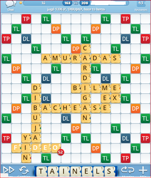 A ver, yo jugaría de esta forma: DIBUJAD acepta una A al final para decir DIBUJADA, pero habría que usar la N del YIN, por lo cual (yo suelo jugar con Validación por 12 monedas desde el móvil, no sé si desde el Facebook se puede) yo probaría encontrar un pleno con esa N seguida de la A, no necesariamente comenzado por NA puesto que la F de fideo acepta cualquier vocal debajo… Si me canso de probar y nada sirve o si lo que juegas no es pleno pero no te deja con buenas letras o los puntos son muy inferiores, jugaría LIANTES debajo de fideo como sugieren los demás… Prueba igual a ver si algo sirve con esa N para aprovechar el DIBUJAD, tomaré papel y lápiz y veré si doy con algo