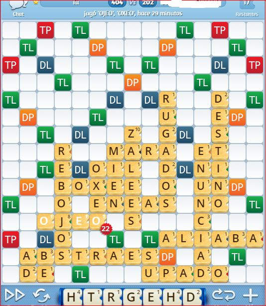 Cambiaría las letras GTDHH en ese orden con la intención de mejorar el atril además de ir conociendo las letras que saldrán sobre el final. Me quedaría con la R porque puede servir para cruzar ROJEO con suerte con pleno. Afortunadamente es la única R disponible así que el rival no dispone de esta posibilidad. Hay algún riesgo de pleno en la A de la última columna, pero si el rival efectivamente tiene muchas vocales es difícil que pueda aprovecharla.