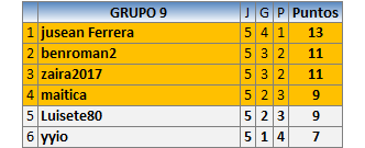 Deja un comentarioEn está página se irán publicando los resultados de las diferentes partidas, siendo ambos jugadores responsables de subirlos o de comprobar que ya hayan sido publicados insertando un COMENTARIO en la parte inferior de la pantalla (opción “Deja tu comentario”), indicando el nombre de los dos jugadores y los puntos obtenidos en la partida.