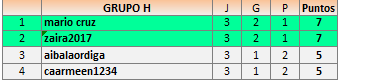 Deja un comentarioEn está página se irán publicando los resultados de las diferentes partidas, siendo ambos jugadores responsables de subirlos o de comprobar que ya hayan sido publicados insertando un COMENTARIO en la parte inferior de la pantalla (opción “Deja tu comentario”), indicando el nombre de los dos jugadores y los puntos obtenidos en la partida.