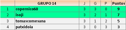 Deja un comentarioEn está página se irán publicando los resultados de las diferentes partidas, siendo ambos jugadores responsables de subirlos o de comprobar que ya hayan sido publicados insertando un COMENTARIO en la parte inferior de la pantalla (opción “Deja tu comentario”), indicando el nombre de los dos jugadores y los puntos obtenidos en la partida.