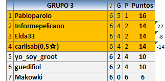 Deja un comentarioEn está página se irán publicando los resultados de las diferentes partidas, siendo ambos jugadores responsables de subirlos o de comprobar que ya hayan sido publicados insertando un COMENTARIO en la parte inferior de la pantalla (opción “Deja tu comentario”), indicando el nombre de los dos jugadores y los puntos obtenidos en la partida.