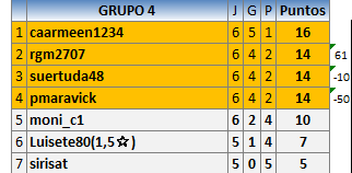 Deja un comentarioEn está página se irán publicando los resultados de las diferentes partidas, siendo ambos jugadores responsables de subirlos o de comprobar que ya hayan sido publicados insertando un COMENTARIO en la parte inferior de la pantalla (opción “Deja tu comentario”), indicando el nombre de los dos jugadores y los puntos obtenidos en la partida.
