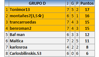 Deja un comentarioEn está página se irán publicando los resultados de las diferentes partidas, siendo ambos jugadores responsables de subirlos o de comprobar que ya hayan sido publicados insertando un COMENTARIO en la parte inferior de la pantalla (opción “Deja tu comentario”), indicando el nombre de los dos jugadores y los puntos obtenidos en la partida.
