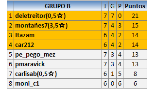 Deja un comentarioEn está página se irán publicando los resultados de las diferentes partidas, siendo ambos jugadores responsables de subirlos o de comprobar que ya hayan sido publicados insertando un COMENTARIO en la parte inferior de la pantalla (opción “Deja tu comentario”), indicando el nombre de los dos jugadores y los puntos obtenidos en la partida.