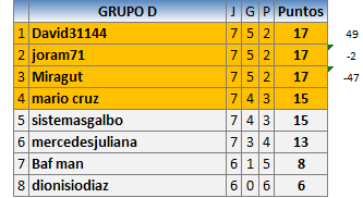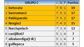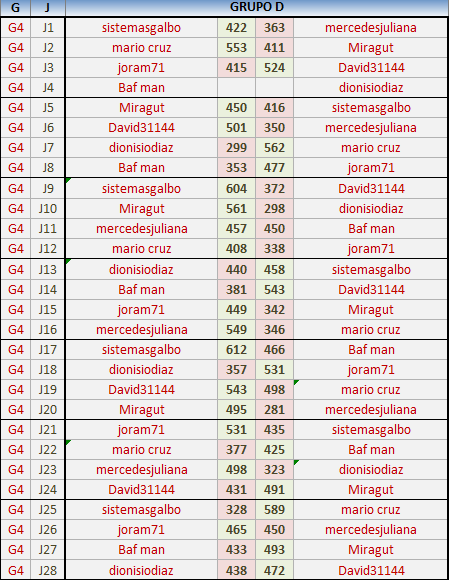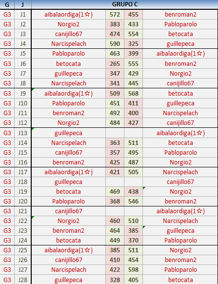 Deja un comentarioEn está página se irán publicando los resultados de las diferentes partidas, siendo ambos jugadores responsables de subirlos o de comprobar que ya hayan sido publicados insertando un COMENTARIO en la parte inferior de la pantalla (opción “Deja tu comentario”), indicando el nombre de los dos jugadores y los puntos obtenidos en la partida.