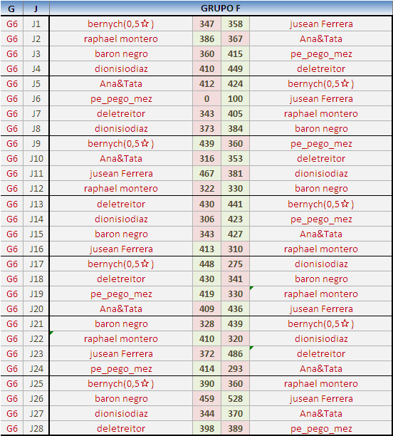 Deja un comentarioEn está página se irán publicando los resultados de las diferentes partidas, siendo ambos jugadores responsables de subirlos o de comprobar que ya hayan sido publicados insertando un COMENTARIO en la parte inferior de la pantalla (opción “Deja tu comentario”), indicando el nombre de los dos jugadores y los puntos obtenidos en la partida.