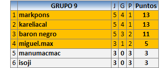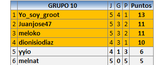 Deja un comentarioEn está página se irán publicando los resultados de las diferentes partidas, siendo ambos jugadores responsables de subirlos o de comprobar que ya hayan sido publicados insertando un COMENTARIO en la parte inferior de la pantalla (opción “Deja tu comentario”), indicando el nombre de los dos jugadores y los puntos obtenidos en la partida.