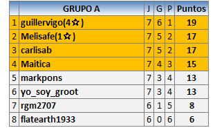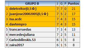 Deja un comentarioEn está página se irán publicando los resultados de las diferentes partidas, siendo ambos jugadores responsables de subirlos o de comprobar que ya hayan sido publicados insertando un COMENTARIO en la parte inferior de la pantalla (opción “Deja tu comentario”), indicando el nombre de los dos jugadores y los puntos obtenidos en la partida.