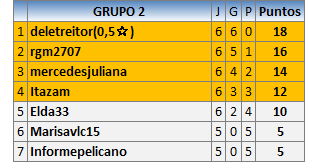 Deja un comentarioEn está página se irán publicando los resultados de las diferentes partidas, siendo ambos jugadores responsables de subirlos o de comprobar que ya hayan sido publicados insertando un COMENTARIO en la parte inferior de la pantalla (opción “Deja tu comentario”), indicando el nombre de los dos jugadores y los puntos obtenidos en la partida.