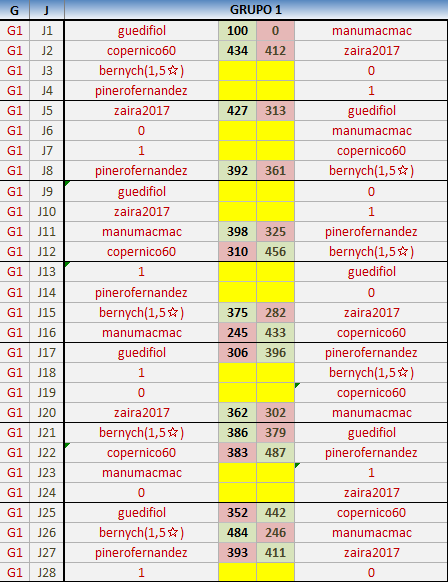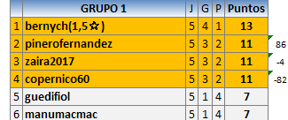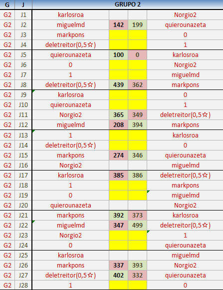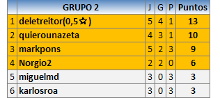 Deja un comentarioEn está página se irán publicando los resultados de las diferentes partidas, siendo ambos jugadores responsables de subirlos o de comprobar que ya hayan sido publicados insertando un COMENTARIO en la parte inferior de la pantalla (opción “Deja tu comentario”), indicando el nombre de los dos jugadores y los puntos obtenidos en la partida.