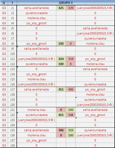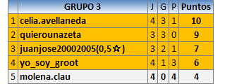 Deja un comentarioEn está página se irán publicando los resultados de las diferentes partidas, siendo ambos jugadores responsables de subirlos o de comprobar que ya hayan sido publicados insertando un COMENTARIO en la parte inferior de la pantalla (opción “Deja tu comentario”), indicando el nombre de los dos jugadores y los puntos obtenidos en la partida.