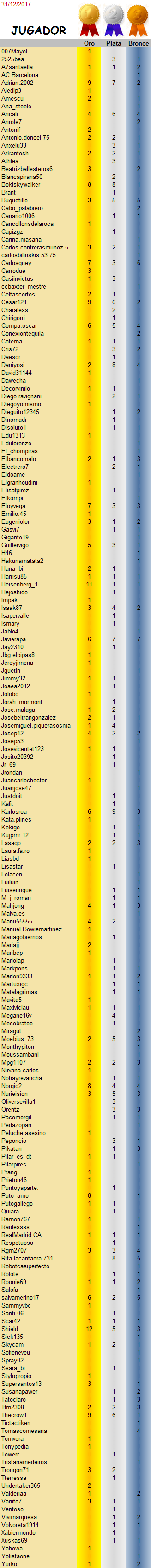 Medallas obtenidas por cada jugador en todos los torneos finalizados hasta la fecha: