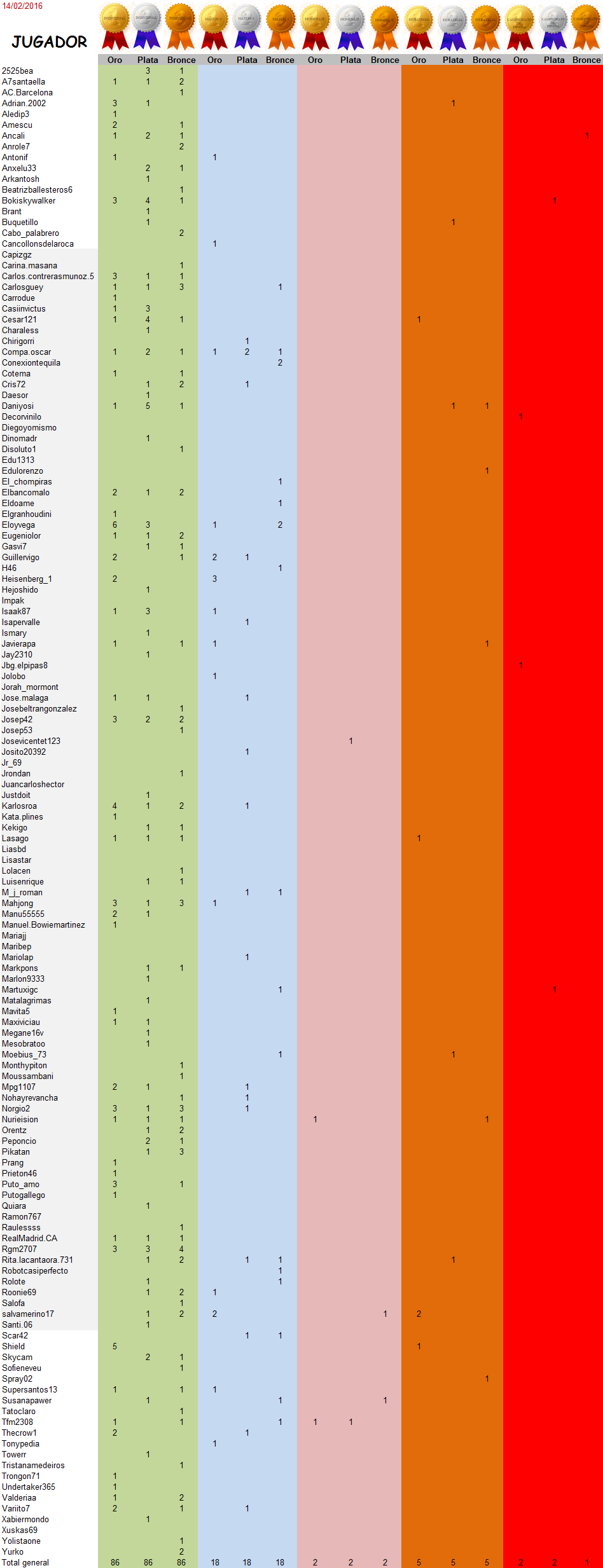 Medallas obtenidas por cada jugador en los torneos de carácter individual: